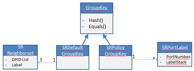 For e.g. a default ECMP group with two buckets pushing label L1 and output to two ports P1 and P2 where neighbor N2 is connected through P1 and N3 is connected through P2. The GroupKey for such a group will be represented with a SRDefaultGroupKey {{N2, N3}, L1}.