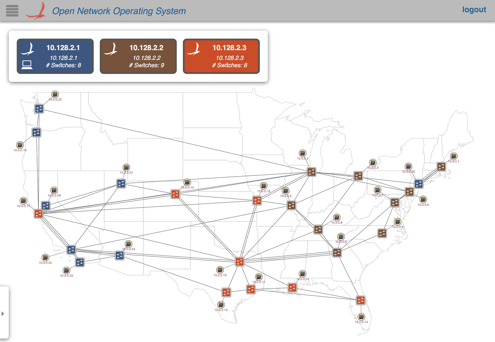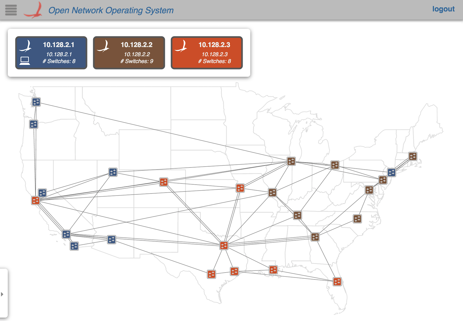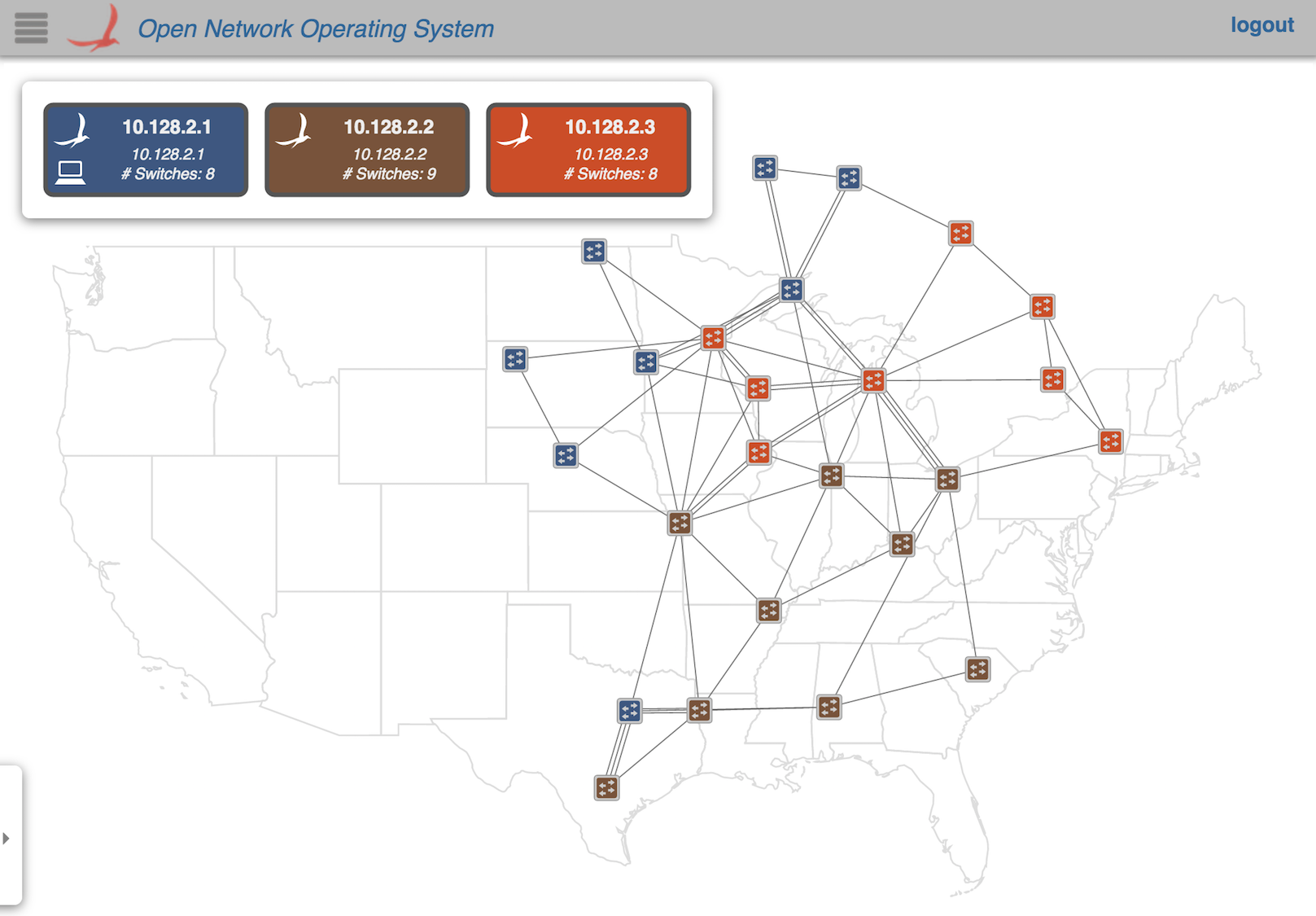 The color coding indicates controller mastership; each device in the topology will be colored corresponding to which instance has mastership over it. For example: