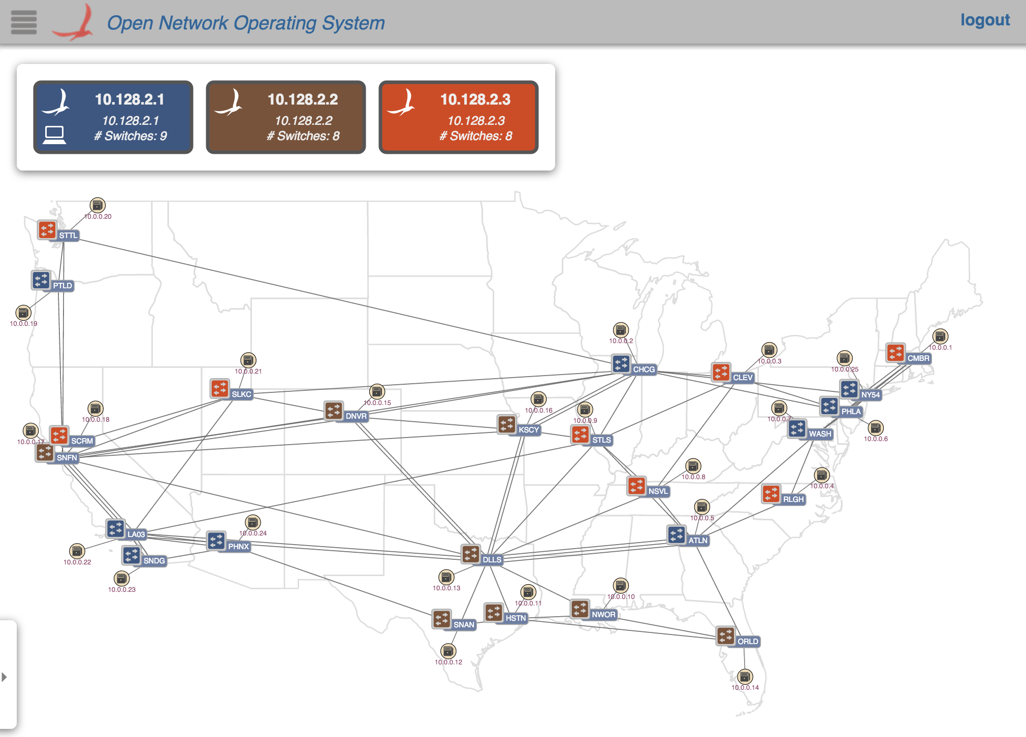 (2) Here, the first instance has failed and the UI has switched over to the second instance. Note also that the remaining two instances have picked up mastership of the switches (now, 9, and 16 respectively):