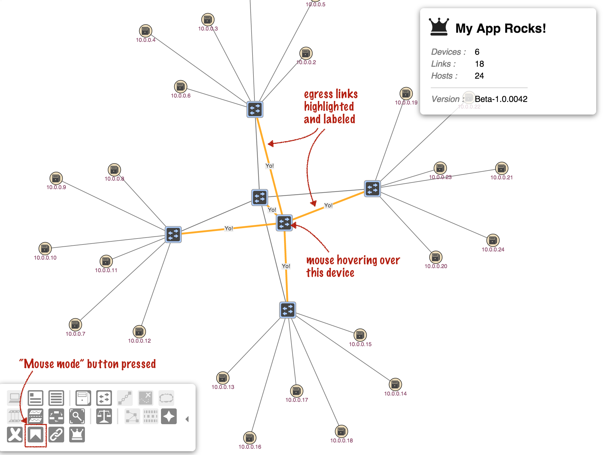 Pressing the "Mouse mode" button and then moving the mouse over devices causes egress links on that device to highlight: