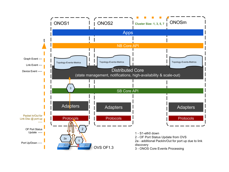 • On link down, a Link Event is generated locally on the nodes triggered by the Device Event; on link up, a Link Event is generated upon completion of the link discovery PacketIn/out; (mostly timing due to OFP messaging and ONOS processing)