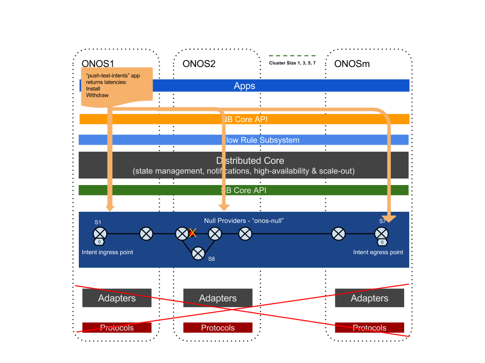 This set of tests aims to characterize ONOS' latencies (i.e. response time) when an application installs or withdraws various batch-sizes of intents. Also we characterize ONOS' response time in an event when the installed intents need to be re-routed due to a path change, e.g. the shortest path is no longer available. This is a test to exercise ONOS from the top of the stack at NB API, through intent and flow subsystems, to the bottom of the stack in SB API, with some effects of substituting Openflow Adaptor with Null Providers. The results of this set of test should provide network operators and application developers with a "first look" of the response time applications can expect when operating intents, in terms of how large the batch intents is, and how the cluster size affect the response time.